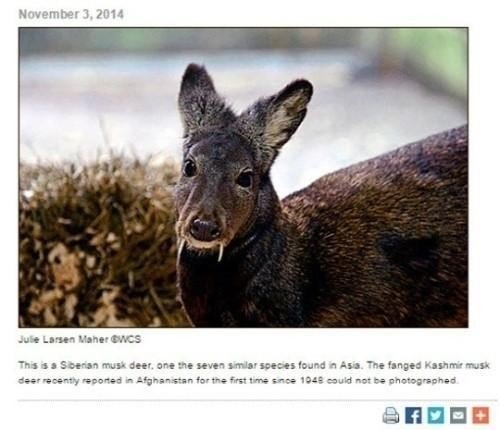 이번에 발견된 카슈미르사향노루는 아프가니스탄·인도·파키스탄 지역 일대에 서식해 왔다. 특히 수컷에게만 존재하는 최대 10㎝길이의 송곳니 때문에 ‘뱀파이어 노루’라는 별명이 붙었다. 이 송곳니는 암컷을 유혹하거나 다른 수컷과 싸울 때 사용한다.