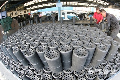 입동을 하루 앞둔 6일 서울 금천구 시흥동 고명산업 연탄공장에서 막 찍어낸 연탄을 도매업자들이 차에 싣고 있다. 400원. 서민들의 겨울을 따뜻하게 지켜줄 연탄 한 장 가격이다.