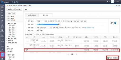 결재한 서류의 데이터에 대한 체계적인 확인 및 관리가 필요하다면 ‘통계’ 기능에 주목하자. 전자결재 항목의 하위 메뉴 중 하나로, 이를 통해 그 동안 자신이 받거나 올린 결재문서, 혹은 소속 부서에서 처리된 결재문서의 현황을 확인할 수 있다. 특히 출장 신청서나 지출 결의서와 같은 DB 문서의 경우는 해당 문서에 기재된 금액 등의 항목만 따로 합산된 결과값을 볼 수 있어 통합 관리에 도움을 준다. 참고로 통계 메뉴의 우측 하단에는 현재 보고 있는 결재문서의 현황을 엑셀파일로 저장할 수 있는 기능도 지원한다.