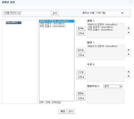 결재문서를 올릴 때 자주 이용하는 결재선이 있다면 이를 따로 지정, 지정해 두는 것도 가능하다. 전자결재 메뉴의 ‘결재선 관리’ 항목을 선택, 결재 대상 및 합의 대상, 그리고 수신 팀원 및 해당 문서를 열람할 수 있는 팀 등을 지정한 후 임의의 이름을 정해 저장해 둘 수 있다. 이렇게 결재선을 저장해 두면 다음 결재문서를 올릴 때 일일이 결재 대상을 지정할 필요 없이 편하게 결재선 지정이 가능하다.