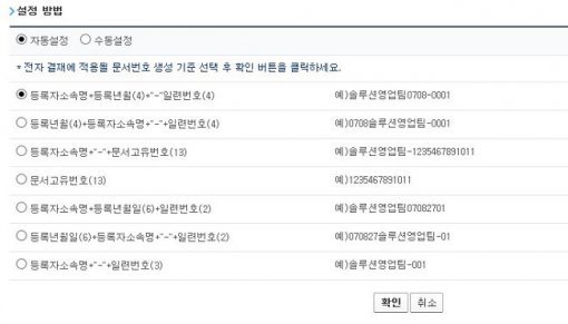 만약 자동설정에서 제공되는 7가지 양식이 모두 맘에 들지 않는다면 ‘수동설정’ 탭으로 이동, 자신만의 방식으로 문서번호가 달리도록 지정할 수도 있다. 단순히 각 항목의 순서나 표시여부를 지정하는 것에 그치지 않고 이를테면 문서의 등록 년을 2자리로 표시할지, 아니면 4자리로 표시할 지의 여부라던가 일련번호를 2자리로 표기할지, 아니면 4자리로 표기 할지 등의 좀 더 세세한 설정이 가능하다.