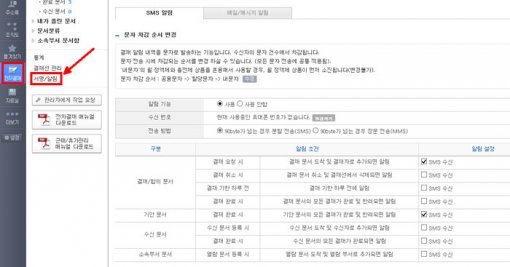 서명/알림 메뉴에서는 전자서명 이미지의 설정 외에 문서의 결재 단계에 따라 SMS(문자)나 메일, 혹은 PC용 하이웍스 메신저를 통해 알림 메시지를 실시간 전송하도록 설정도 가능하다. 결재의 요청이나 취소 혹은 결재 완료와 같은 이벤트가 발생하면 관련 메시지를 실시간으로 받을 수 있다. 그 외에 결재 기간 하루 전에 미리 메시지를 받을 수 있는 등, 업무의 밀림을 방지하는 설정도 가능하다.