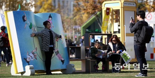 ‘2014 서울 북 페스티벌’을 찾은 시민들이 9일 서울 중구 서울광장 잔디밭 위에 마련된 의자에 앉아 독서 삼매경에 빠져 있다. 이날 행사장에는 여러 가지 모양의 책 조형물이 설치돼 이를 배경으로 사진을 찍는 시민들도 많았다. ‘도서관에서 책으로 시민의 삶을 꽃피우다’라는 주제로 열린 이번 행사는 많은 시민에게 책을 접할 기회를 제공하기 위해 서울시가 마련했다.