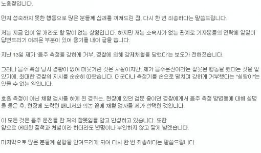 그러면서 "호흡 측정이 아닌 채혈 검사를 하게 된 경위는, 현장에 있던 검문 중이던 경찰에게서 음주 측정 방법들에 대해 설명을 들은 후, 현장에 도착한 매니저와 의논 끝에 채혈 검사를 제가 선택한 것입니다"라고 경위를 설명했다.