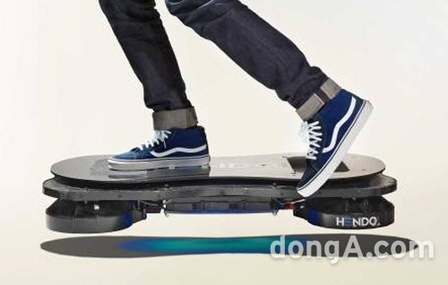캘리포니아의 ‘헨도’사가 만든 이 호버보드는 배터리 수명이 15분에 불과하며 아직까지는 구리, 알루미늄 등 전도성 물질 위에서만 3cm가량 떠오를 수 있다.