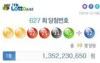 6일 발표된 로또 627회 당첨번호는 '2·9·22·25·31·45'번이다. 2등 보너스 번호는 '12'번이다.