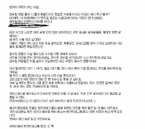 자신을 원전반대그룹의 회장이라고 소개한 글쓴이는 한수원을 '악당'이라고 비난하면서 '고리 1,3호기 월성 2호기 가동을 크리스마스부터 중단하지 않으면 아직 공개 안한 자료 10여만장도 추가로 공개하고 2차 파괴를 실행하겠다'는 내용으로 협박했다.