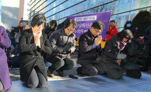 통합진보당 해산심판 결정을 하루 앞둔 18일 이정희 대표(왼쪽) 등 통진당 당원들이 서울 종로구 헌법재판소 근처에서 ‘해산 반대’를 주장하며 108배를 하고 있다. 원대연 기자 yeon72@donga.com