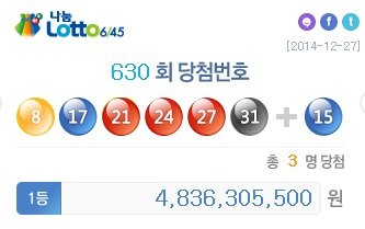 로또630회당첨번호를 모두 맞춘 1등 당첨자는 모두 3명으로 1인당 48억3630만5500원을 받게 됐다.