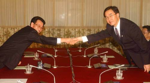 2002년 9월 11일 북한 고성군 온정리 금강산여관에서 열린 제2차 금강산 관광 당국자회담 전체회의에서 조명균(오른쪽) 남측 수석대표와 김택룡 북측 수석대표가 악수하고 있다.