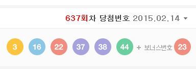 14일 추첨한 제637회 나눔로또 1등 당첨번호는 '3, 16, 22, 37, 38, 44'로 결정됐다. 보너스 번호는 '23'이다.