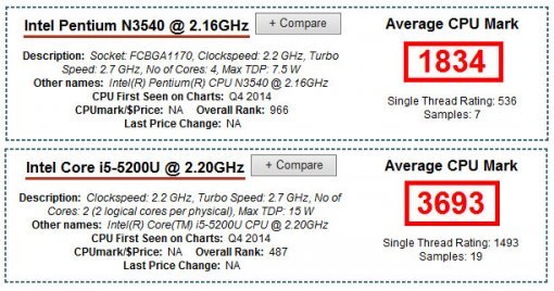 두 CPU에 대한 설명을 하기에 앞서 일단은 성능 측정 결과부터 좀 보시죠. CPU의 연산능력을 수치화해서 점수를 매기는 PASSMARK 벤치마크 기준, 펜티엄 N3540는 1,834점을 기록했습니다. 그렇다면 코어 i5-5200U는? 무려 3,693점입니다. 펜티엄 N3540이 코어 i5-5200U에 비해 코어의 수는 2배인데 실제 성능은 오히려 절반이라는 의미죠.