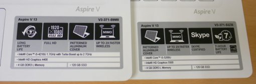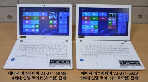 에이서 V3-371-59M8 모델은 4세대 코어 i5-4210U(하스웰)를, 에이서 V3-371-53ZB는 5세대 코어 i5-5200U(브로드웰)을 탑재했다. 그 외에는 메모리 4GB, 120GB의 SSD, 그리고 CPU 내장 그래픽을 갖췄다는 점에서 같다. 참고로 에이서의 아스파이어 V3-371 시리즈는 20mm 이하의 얇은 두께와 13.3인치의 화면을 갖춘 슬림형 노트북으로, 60만원대에 살 수 있다. 휴대성과 성능이 조화를 이루고 있으면서 비교적 저렴한 노트북을 찾는 소비자들에게 제법 인기를 끌고 있는 제품이다.