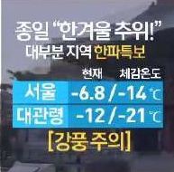 기상청 관계자는 "서해안과 남해안, 강원도 일부에는 강풍주의보까지 발효되면서 체감온도는 더욱 낮겠다"며 "내일까지 기온이 내려가고 모레부터는 점차 오르겠지만 당분간 추운날씨는 이어지겠다"고 말했다.