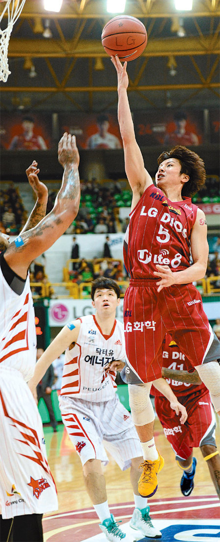 프로농구 LG의 김시래(오른쪽)가 16일 창원체육관에서 열린 플레이오프 6강 5차전에서 오리온스 길렌워터의 수비를 피해 레이업슛을 하고 있다. 김시래는 팀 최다인 22득점을 책임지며 팀의 승리를 이끌었다.
