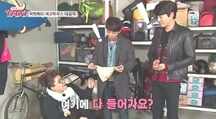 이천희는 박스를 열어 안에 있는 물건을 꺼내던 중 발레용 티팬티가 나오자 당황했다. 이에 MC 이영자는 “여기에 다 들어가요?”라고 놀려 폭소를 자아냈다.