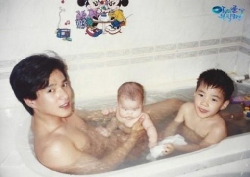 조재현이 갓난아기 시절의 조혜정, 어린 시절 아들 조수훈과 함께 한 욕조에서 목욕을 즐기고 있는 모습이다.