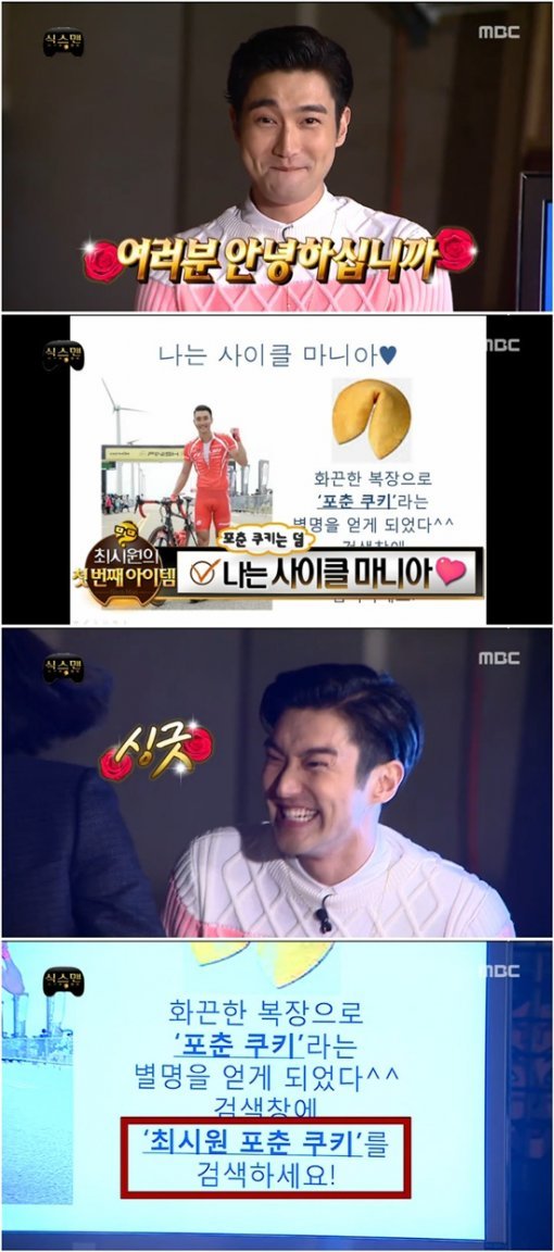 이날 ‘무한도전’에서 최시원은 사이클과 관련한 아이템을 내놨다. 최시원은 프리젠테이션에 앞서 ‘검색어에 최시원의 포춘쿠키를 검색하세요’라는 문구를 선보이며, 사이클 복장 차림의 민망한 사진을 공개해 주위를 폭소케 했다.
