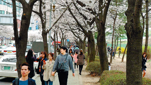 13일 인천의 꽃길 명소로 자리잡은 수인전철 연수역과 원인재역 사이 길이 1.5km의 벚꽃터널을 시민들이 걷고 있다.
