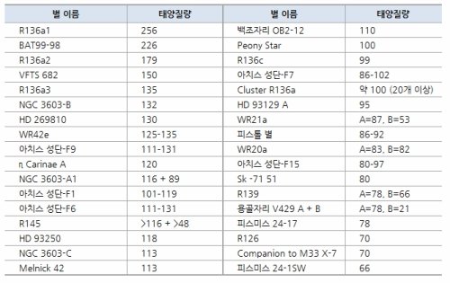 별들은 저마다 밝기나 크기, 수명이 다르지만 그 중 가장 중요한 물리량은 바로 질량이다. 천문학자들은 별의 한계질량을 태양질량의 150배 내외로 추정하고 있다.