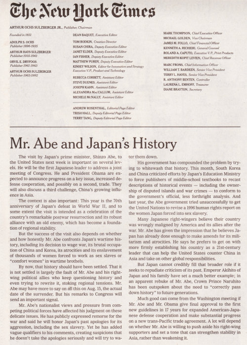 미국 일간 뉴욕타임스(NYT)는 20일(현지시간) '아베 총리와 일본의 역사'라는 제목의 사설에서 "방미의 성공 여부는 아베 총리가 얼마나 정직하게 일본의 전쟁 역사를 마주할 것인 지에도 달려 있다"고 밝혔으며 "이는 그가 사과 문제를 진지하게 여기지 않고 있으며, 나아가 이를 희석하려 하고 있다는 의심을 사게 한다"고 비판했다.