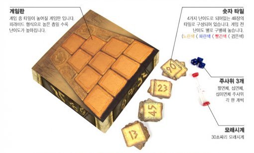 재빠른 연산으로 숫자 타일을 가져가자!보드게임 '파라오 코드'는 어떻게 하는 게임일까? 게임을 하기 전에 먼저 구성물을 살펴보도록 하자. 구성물은 게임판, 숫자 타일 48장, 주사위 3개, 모래시계 등이다. 주사위는 8면체, 10면체, 12면체 주사위로 구성됐다.