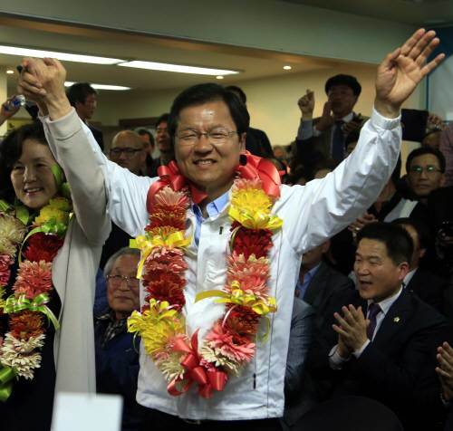 4.29 재보선 광주 서구을 무소속 천정배 후보가 당선확정이 발표되자 꽃다발을 목에 걸고 환호 하고 있다. 광주=박영철 기자