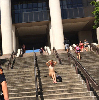 영국 데일리메일은 모니카 로스트볼드(Monika Rostvold)라는 이름의 22세 여성이 미국 텍사스 주(州) 샌마르코스에 위치한 텍사스 주립대학교 도서관 앞 계단에서 옷을 한 꺼풀씩 벗고 나체에 가까운 상태로 약 45분 간 암묵 시위를 펼쳤다고 1일(이하 현지시간) 소개했다.