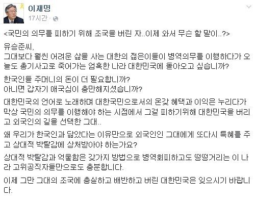 이재명 성남시장은 "유승준씨, 그대보다 훨씬 어려운 삶을 사는 대한의 젊은이들이 병역의무를 이행하다가 오늘도 총기사고로 죽어가는 엄혹한 나라 대한민국에 돌아오고 싶습니까?"라고 일침을 날렸다.