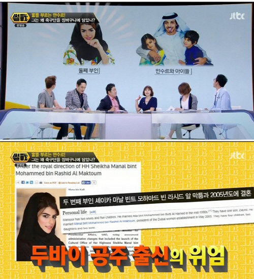 MC 강용석은 “아랍국가가 일부다처제인데, 만수르의 둘째 부인이 어마어마하게 예쁘다”고 했고, 대형 화면에는 만수르의 둘째 부인 사진이 공개됐다.