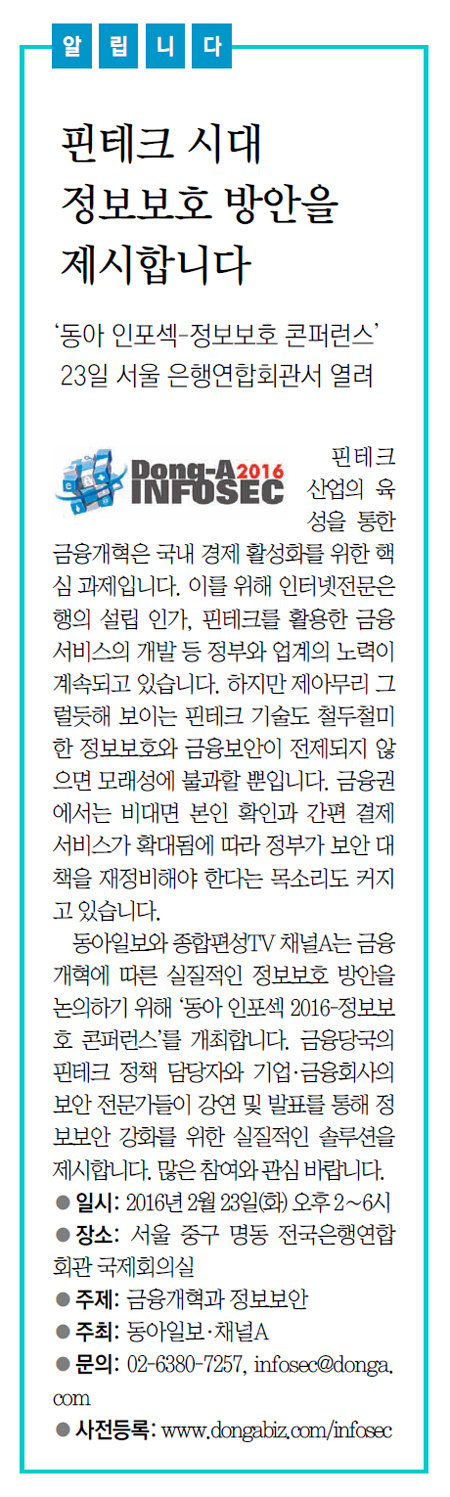 ‘동아 인포섹-정보보호 콘퍼런스’… 23일 서울 은행연합회관서 열려