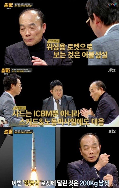 이에 전원책은 "인공위성을 쏘긴 쐈는데 목적은 다른 곳에 있다"면서 "북한 광명성이라고 부르는 은하4호는 200kg 남짓되는 뭔가가 하나 달렸다. 미국에서 보면 우주에서 육갑을 떠는 거다"라고 거칠게 비난했다.