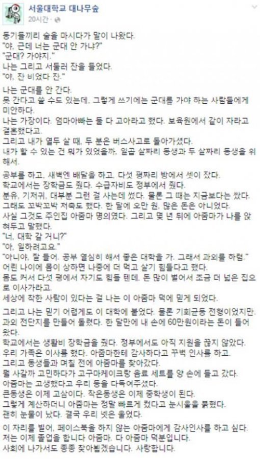 최근 사회관계망 서비스(SNS)인 페이스북 '서울대학교 대나무숲'에 서울대 학생으로 추정되는 학생의 사연이 올라왔다.