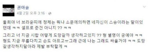 권아솔은 앞서 2일에도 자신의 페이스북에 “둘희야 네 브라운띠의 정체는 뭐냐. 소문에 의하면 네 자신이 스승이라는 말이 있던데 셀프로 준 건 아니지? 그리고 너 지금 시합 어떻게 도망갈까 생각하고 있지? 형 별명이 궁예야. 형도 지금 무릎 다치고 손도 아프고…근데 나는 그래도 싸울거야. 도망갈 생각하지말아라 제발 부탁할게”라는 글로 이둘희를 자극했다.