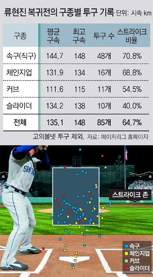 속도는 나쁘지 않았다. 류현진은 1회초 마운드에 오르자마자 시속 145km짜리 빠른 공(속구)을 던졌다. 이후로도 속구 평균 속도 시속 144.7km를 유지했다. 최고 구속도 트레이닝 전문가들이 메이저리그 복귀 조건으로 꼽은 시속 148km에 도달했다.