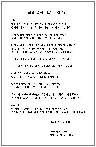 해당 논란이 불거진 직후 정 사장은 자사 홈페이지를 통해 “저의 경솔한 행동으로 인하여 상처를 받은 분들께 깊이 머리 숙여 사죄드리며, 용서를 구합니다. 관계된 분들을 찾아뵙고 사과를 드리겠습니다”라고 공식 사과 했다.