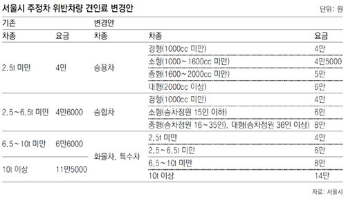 서울시가 1999년 이후 17년간 동결됐던 주정차 위반 차량 견인료 부과 체계를 바꾼다. 일괄적으로 4만 원이었던 승용차 견인료를 배기량에 따라 차등을 두는 게 핵심이다. 비싼 수입차나 대형 차량은 놔두고 ‘만만한’ 경·소형차만 견인하는 폐단을 줄이려는 취지다.