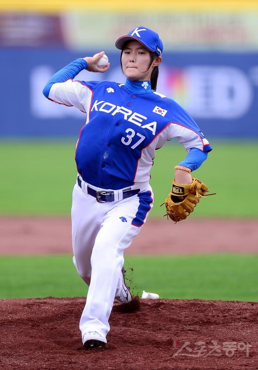 드림볼파크에서 열렸다. 한국 선발투수 강정희가 역투하고 있다.