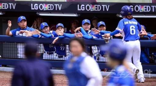 드림볼파크에서 열렸다. 3회초 무사 2루 한국 임경은 중전 안타 때 득점한 이보현이 더그아웃에서 하이파이브 하고 있다.