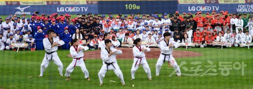 3일 부산 기장군 현대차 드림볼파크에 WBSC(세계야구소프트볼연맹) 2016 기장여자야구월드컵 개막식에서 출전 선수들이 태권도 시범을 보고 있다.