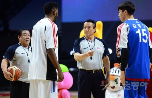 22일 부산 사직실내체육관에서 ‘2016-2017 KCC 프로농구 올스타전’이 열렸다. 경기에 앞서 열리는 3x3 오프닝 경기에서 김동광, 김태환 해설위원이 심판을 맡아 진행하고 있다.