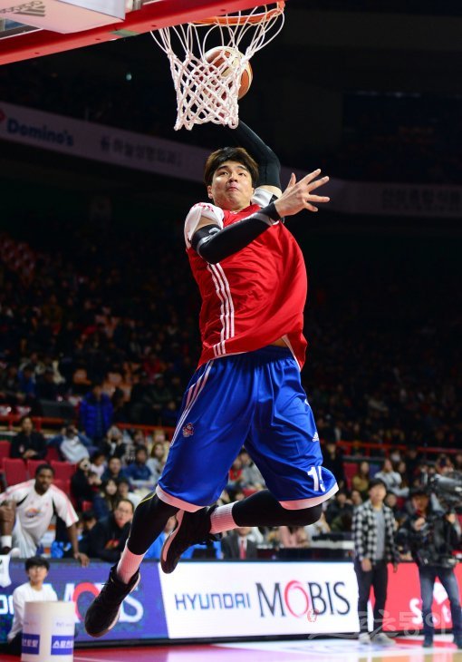 22일 부산 사직실내체육관에서 ‘2016-2017 KCC 프로농구 올스타전’이 열렸다. 경기에 앞서 열리는 덩크슛컨테스트에서 LG 김종규가 덩크슛을 성공시키고 있다. 김종규는 결승에 진출했다.