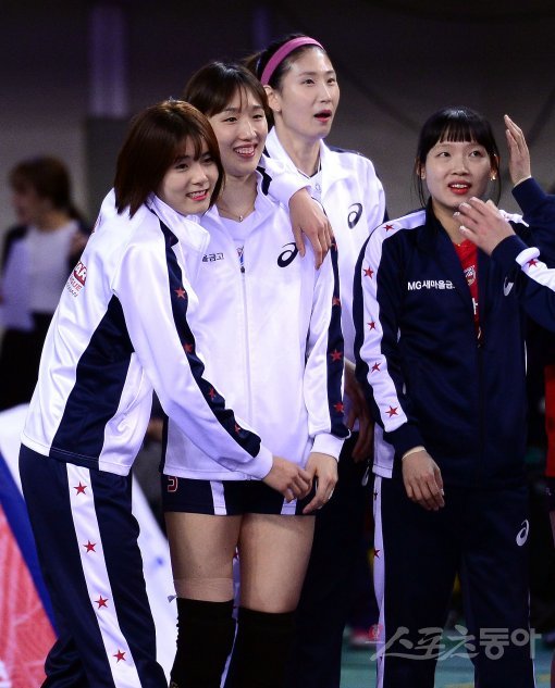 ‘NH농협 2016~2017 V리그’ 올스타전이 22일 천안유관순체육관에서 열렸다. 플로터 서브 컨테스트 퀸에서 K스타 이다영이 황연주와 어깨동무를 하고 바라보고 있다.