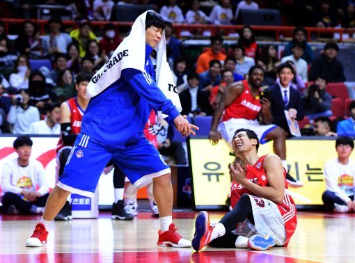 22일 부산 사직실내체육관에서 ‘2016-2017 KCC 프로농구 올스타전’이 열렸다. 덩크슛 컨테스트 결승전에 오른 김현민이 박상오의 도움으로 도깨비를 패러디하고 있다. 김현민은 덩크왕을 차지했다.