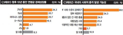 먼저 경제부터 살펴보자. 전문가들은 향후 10년간 우리나라 연평균 경제성장률(국내총생산(GDP) 기준)이 1~2%대에 머물 것이라고 내다봤다. 2%대 성장률에 대한 응답률이 24.3%로 가장 높았다. 1%대 성장률 응답은 20.7%였다. 1% 미만 성장률을 보일 것이라는 응답은 19.5%, 마이너스 성장을 할 것이라는 응답도 20.7%로 나타났다. 3%대 성장률(4.7%)과 4% 이상 성장률(1.8%)을 점친 전문가는 극히 드물었다(그래프1). 한국이 외환위기를 맞았던 1998년(-5.5%)과 미국발(發) 금융위기를 겪었던 2008년(0.7%)을 연상케 하기에 충분한 전망치들이다.