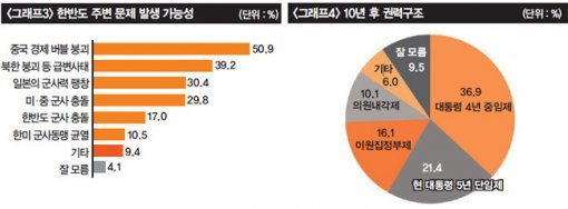 전문가는 대부분 국내의 총체적인 경제위기와 국외의 중국 경제 버블 붕괴를 한국 경제에 가장 큰 장애 요소로 꼽았다. 한국 경제가 내우외환을 겪으리라는 얘기다. 특히 군사 충돌보다 경제위기에 더 예민하게 반응했다.