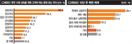 이번에는 문화다. ‘한국 사회가 보다 성숙해지기 위해 가장 먼저 고쳐야 하는 문화 또는 의식은 무엇인지’ 물었다(복수 응답). ‘권위주의’라는 응답이 56.3%로 가장 높았다. 그다음으로 연고주의 34.5%, 집단·국가주의 19.7%, 군사문화 17.6%, 온정주의 16.2%, 성과주의 12.7%, 가족주의 11.3%, 가부장주의 9.2% 순이었다(그래프5). 혁신경제와 정치개혁의 공통된 과제가 있다면 권위주의와 연고주의 타파일 것이다. 연고주의로 만들어진 사회·경제적 특권을 유지하려면 권위주의를 동원할 수밖에 없다. 민주화세력이 비판받는 온정주의도, 산업화세력이 비판받는 성과주의도 권위주의 앞에선 아무것도 아닌 걸까.