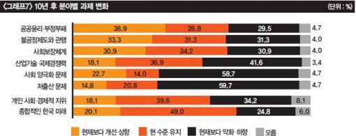 한국 사회의 분야별 과제는 10년 후 어떤 모습일까. 개선되거나 발전할까, 아니면 악화되거나 후퇴할까. 분야별로 다소 차이를 보였지만 앞서 언급했듯이 어둡고 무거운 전망으로 가득하다. ‘불공정제도와 관행’은 개선(33.3%)과 악화(31.3%) 예상이 비등했다. ‘사회보장체계’는 개선(30.9%)과 악화(30.9%)가 동일했다. ‘산업기술 국제경쟁력’은 악화(41.6%)가 개선(18.1%)보다 높게 나타났다. ‘사회 양극화 문제’도 악화(58.7%)가 개선(22.7%)보다 높았다. ‘저출산 문제’ 역시 악화가 59.7%로 개선(14.8%)보다 압도적으로 높았다. ‘개인의 사회·경제적 지위’는 향상되리라는 전망(18.1%)보다 낮아지리라는 전망(34.2%)이 우세했다. ‘각 분야를 종합한 대한민국의 미래’는 낙관론(20.1%)과 비관론(24.8%)이 비슷했다. 불행 중 다행인 것은 ‘공공윤리·부정부패’는 개선될 것(38.9%)이라는 의견이 악화될 것이라는 전망(29.5%)보다 조금 앞섰다는 점이다(그래프7). 공공윤리·부정부패 분야의 개선 전망이 미래 한국 사회에 드리운 어두운 전망을 어느 정도 걷히게 할지 궁금하다.