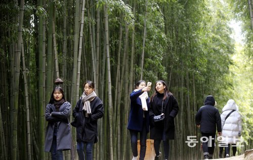 지난달 30일 전남 담양군 담양읍 전통 대나무 정원인 죽녹원을 찾은 관광객들이 한겨울에도 녹음이 짙은 대나무 숲길을 걷고 있다.