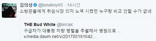 김의성은 이날 자신의 트위터에 "소방관들에게 취임식장 의자 노역 시켰던 누구랑 비교 안할 수가 없네"라며 구급차가 대통령 차량 행렬을 추월해서 병원으로..."라는 글을 링크했다.